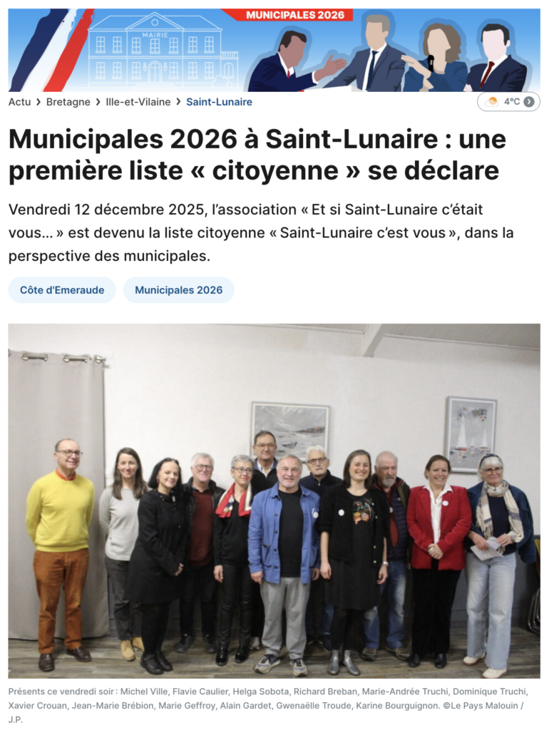 Tout au long de l’année 2025, l’association Et si Saint-Lunaire c’était Vous… a animé une démarche de démocratie participative et citoyenne visant à co-construire un projet pour Saint-Lunaire avec sa population. De cette réflexion partagée et de cette intelligence collective, s’est dessiné un projet, une vision pour l’avenir de Saint-Lunaire.