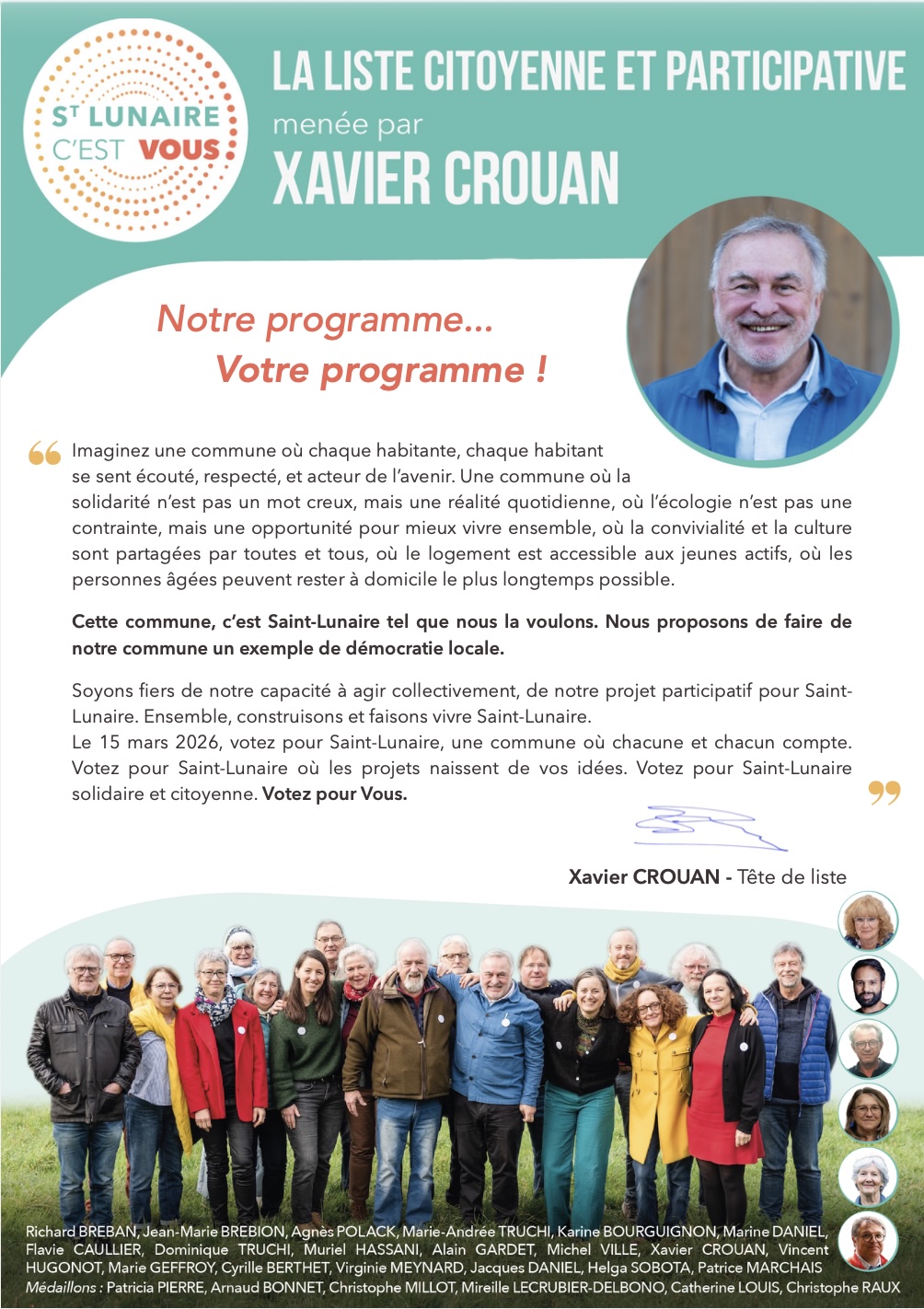 Dimanche 15 mars 2026, au premier tour des élections municipales, 537 Lunairiennes et Lunairiens ont exprimé leur confiance à la liste citoyenne et participative “Saint-Lunaire c’est Vous”, menée par Xavier Crouan, nous octroyant 27% des suffrages exprimés, ce qui est plus qu’honorable pour une proposition aussi novatrice que la nôtre.
